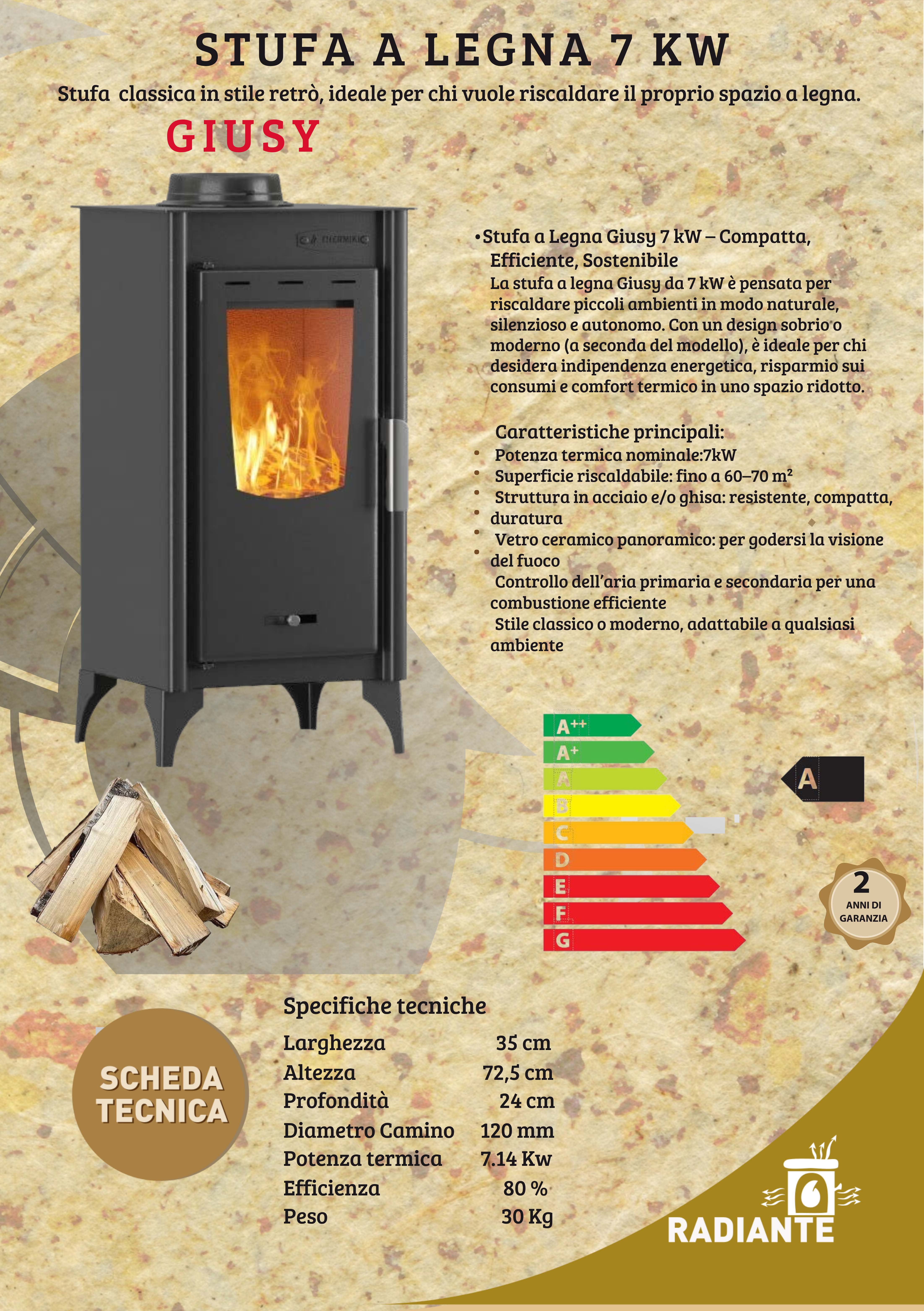 La stufa a legna Giusy da 7 kW è pensata per riscaldare piccoli ambienti in modo naturale, silenzioso e autonomo. Con un design sobrio o moderno (a seconda del modello), è ideale per chi desidera indipendenza energetica, risparmio sui consumi e comfort termico in uno spazio ridotto.