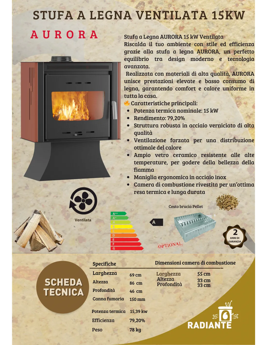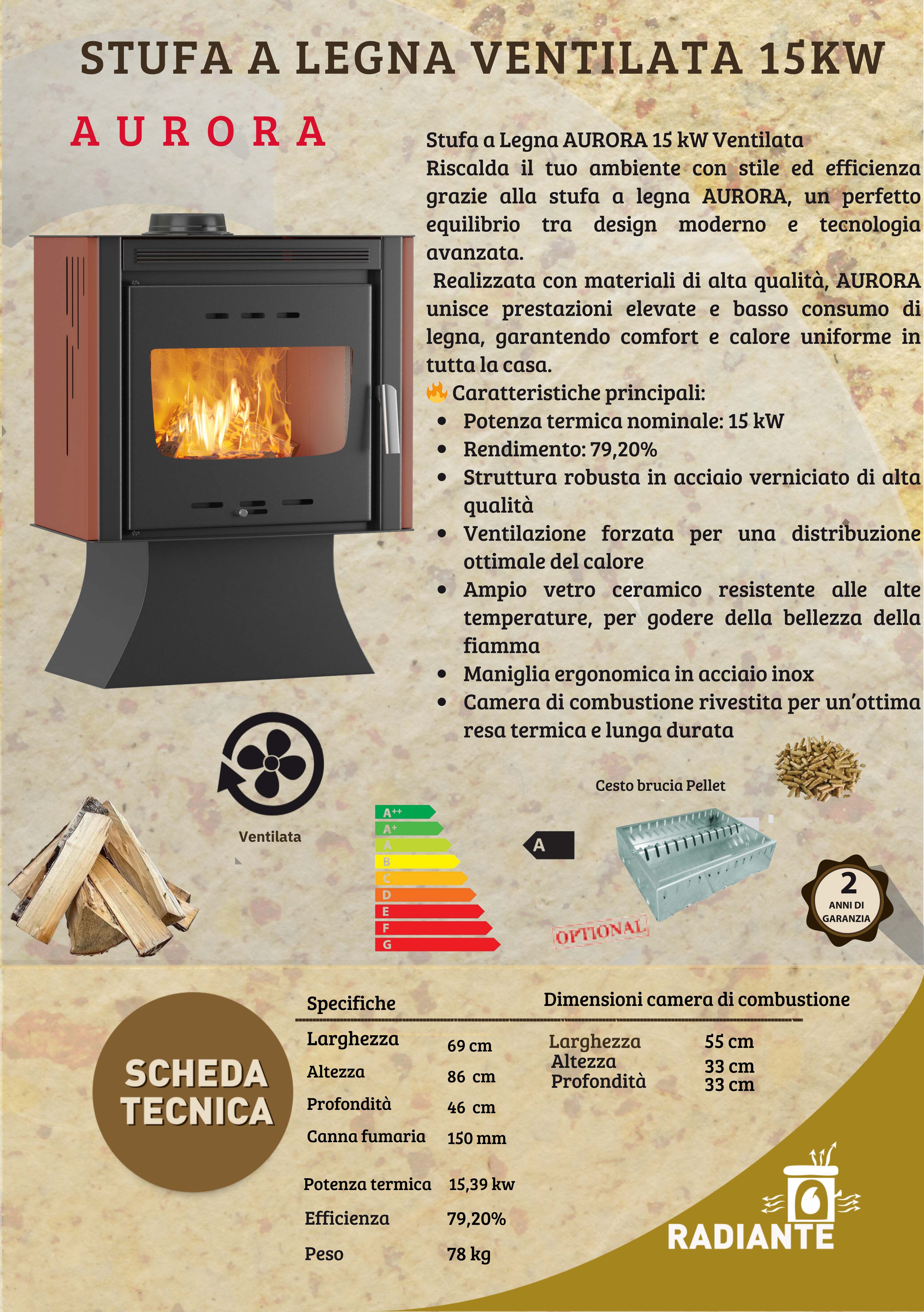 Riscalda il tuo ambiente con stile ed efficienza grazie alla stufa a legna AURORA 15 kW, un perfetto equilibrio tra design moderno e tecnologia avanzata.
