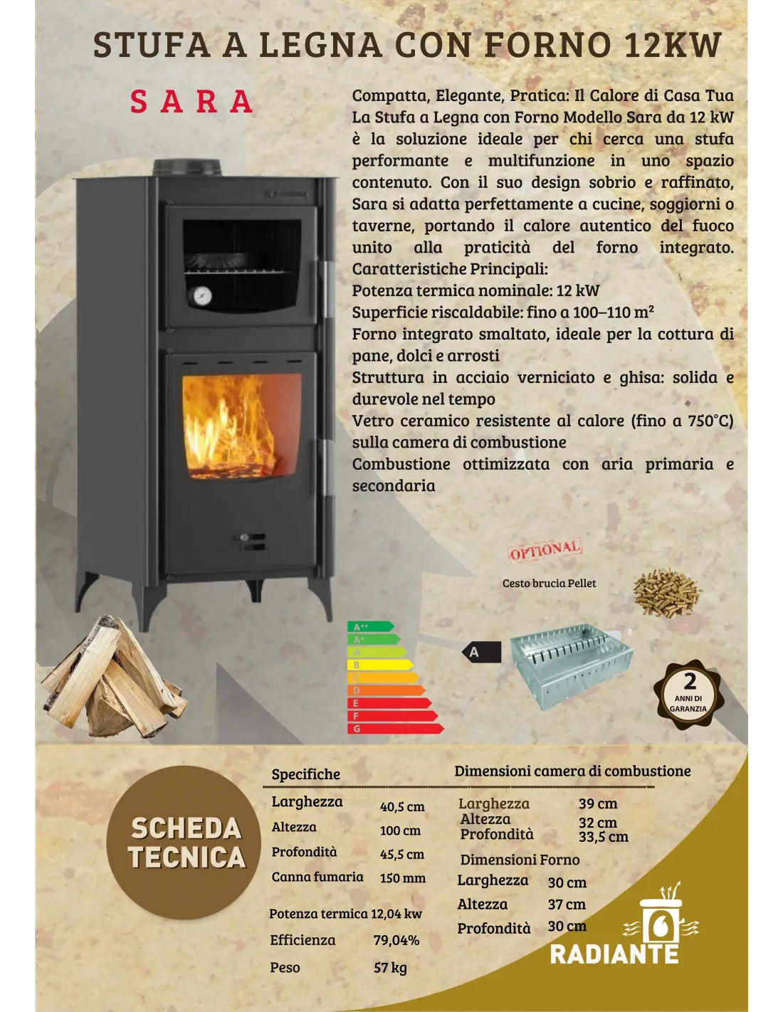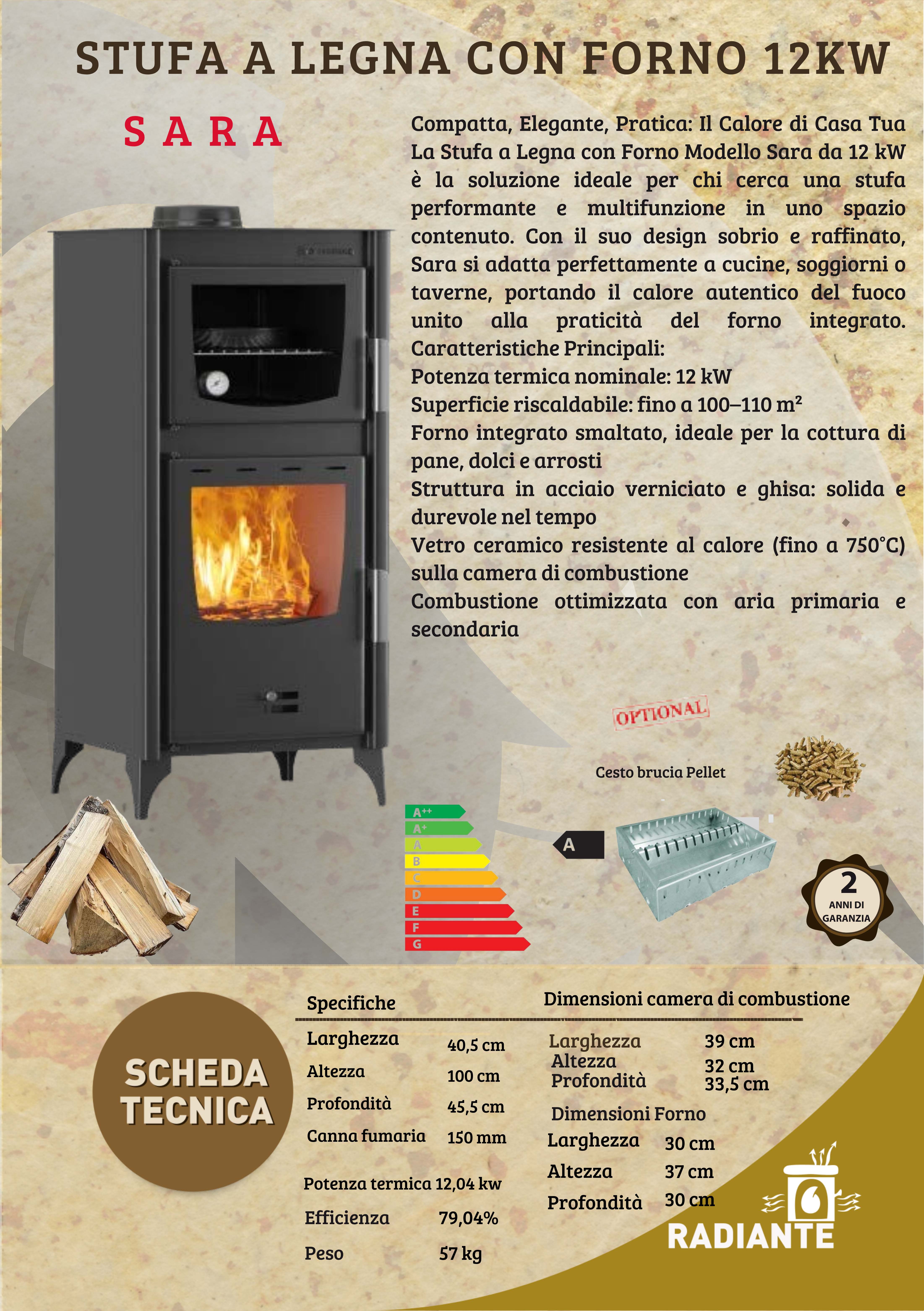 La Stufa a Legna con Forno Modello Sara da 12 kW è la soluzione ideale per chi cerca una stufa performante e multifunzione in uno spazio contenuto. Con il suo design sobrio e raffinato, Sara si adatta perfettamente a cucine, soggiorni o taverne, portando il calore autentico del fuoco unito alla praticità del forno integrato.