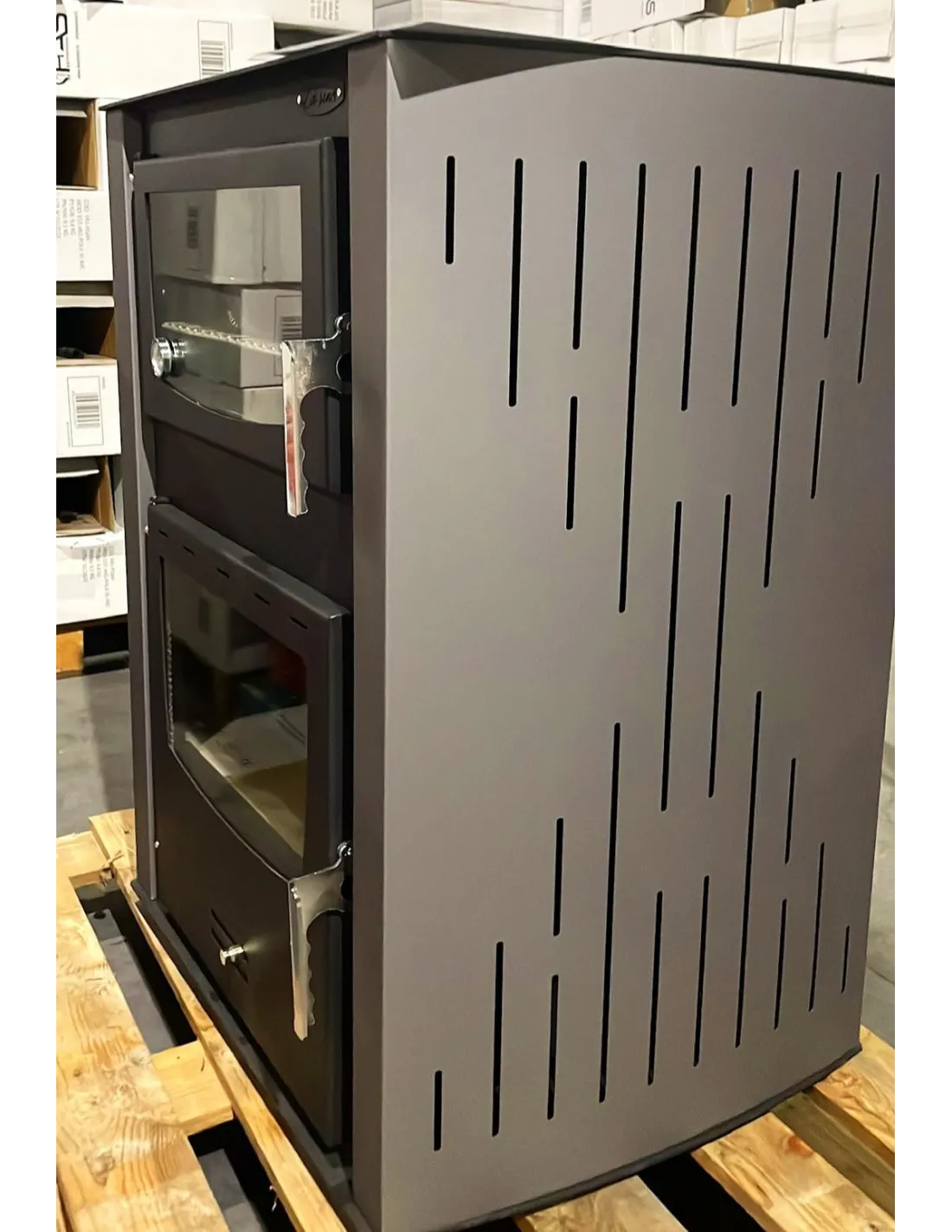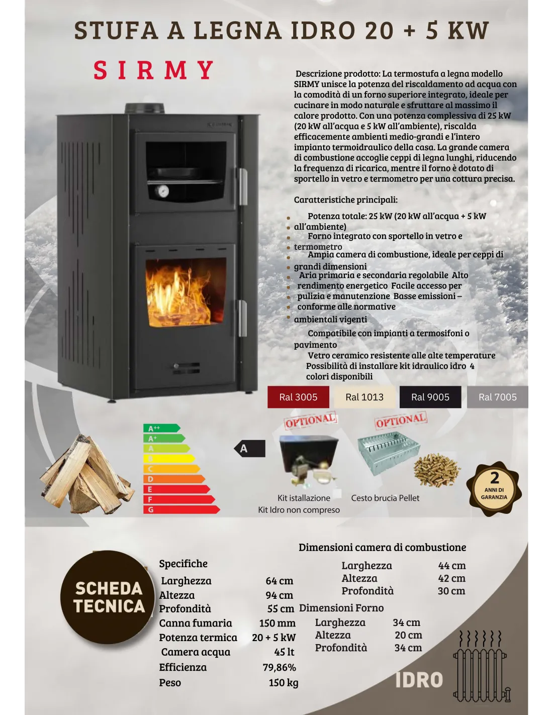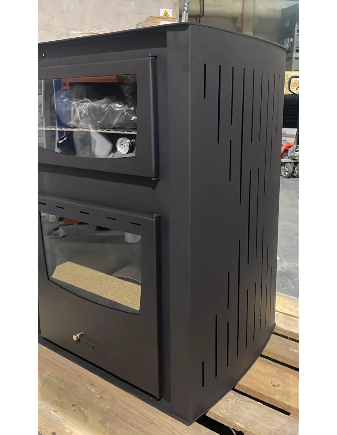 La termostufa a legna modello SIRMY unisce la potenza del riscaldamento ad acqua con la comodità di un forno superiore integrato, ideale per cucinare in modo naturale e sfruttare al massimo il calore prodotto. Con una potenza complessiva di 25 kW (20 kW all’acqua e 5 kW all’ambiente), riscalda efficacemente ambienti medio-grandi e l’intero impianto termoidraulico della casa.
