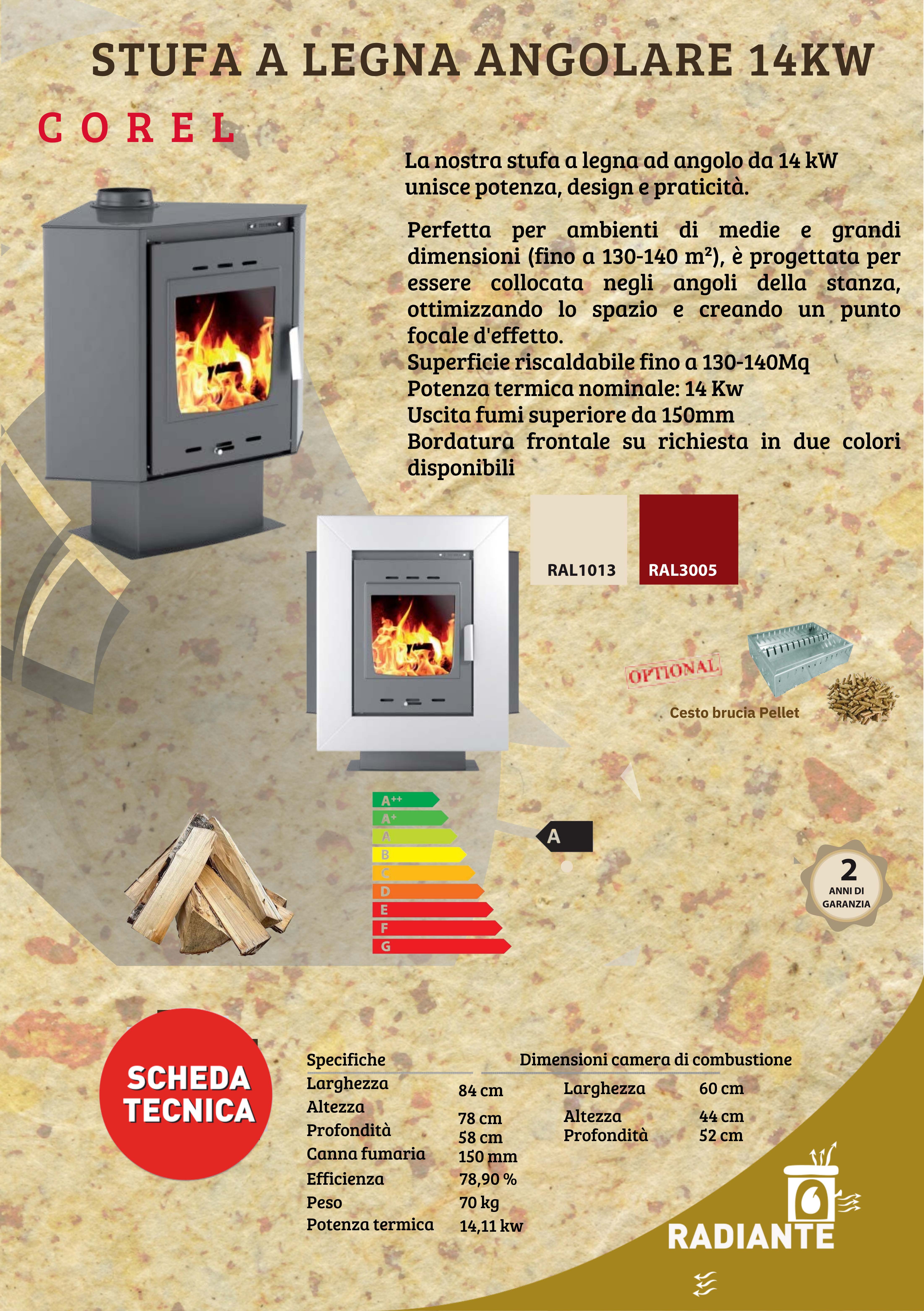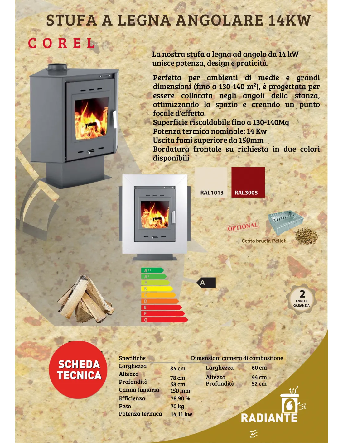 La nostra stufa a legna ad angolo da 14 kW unisce potenza, design e praticità. Perfetta per ambienti di medie e grandi dimensioni (fino a 130-140 m²), è progettata per essere collocata negli angoli della stanza, ottimizzando lo spazio e creando un punto focale d'effetto.