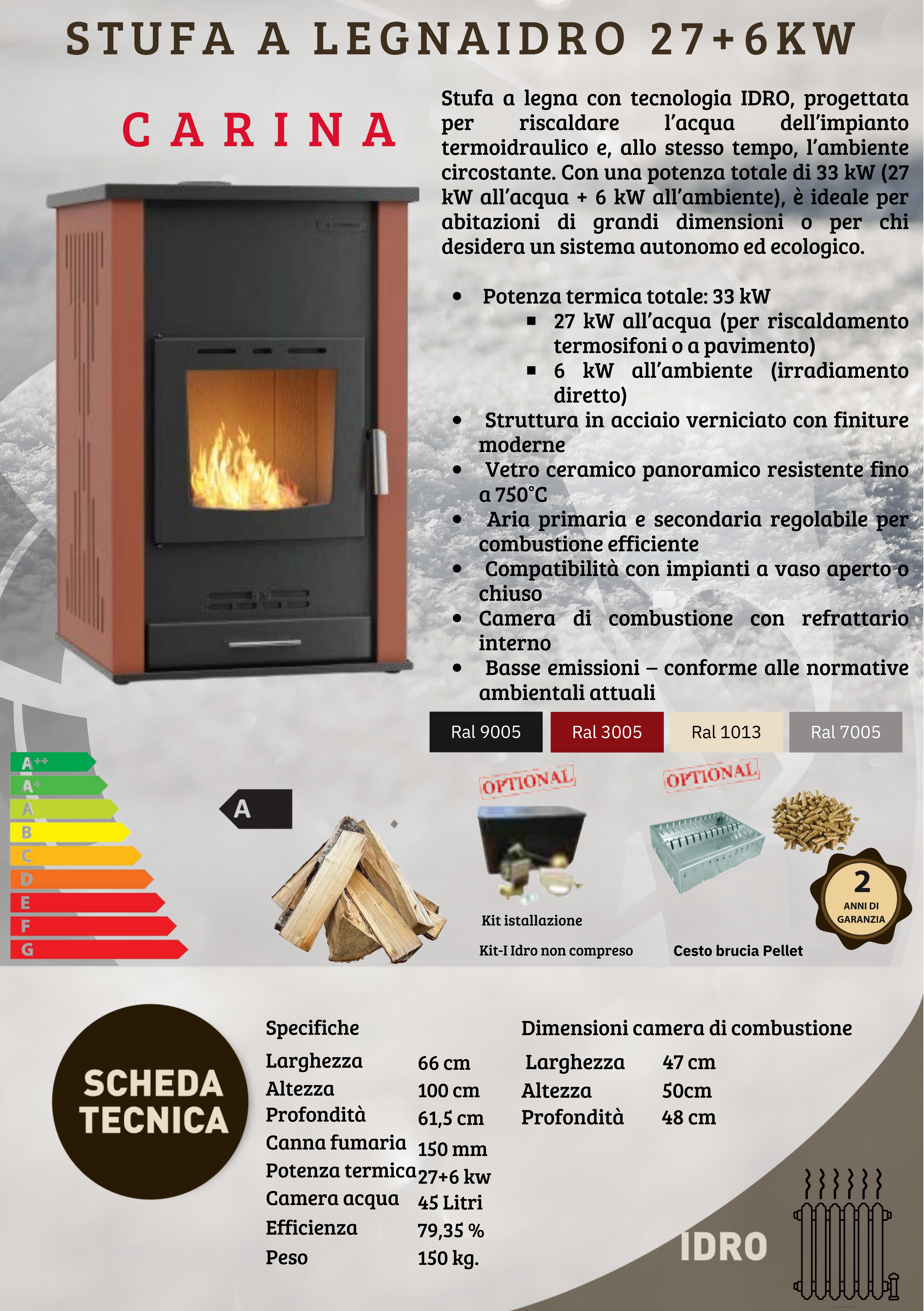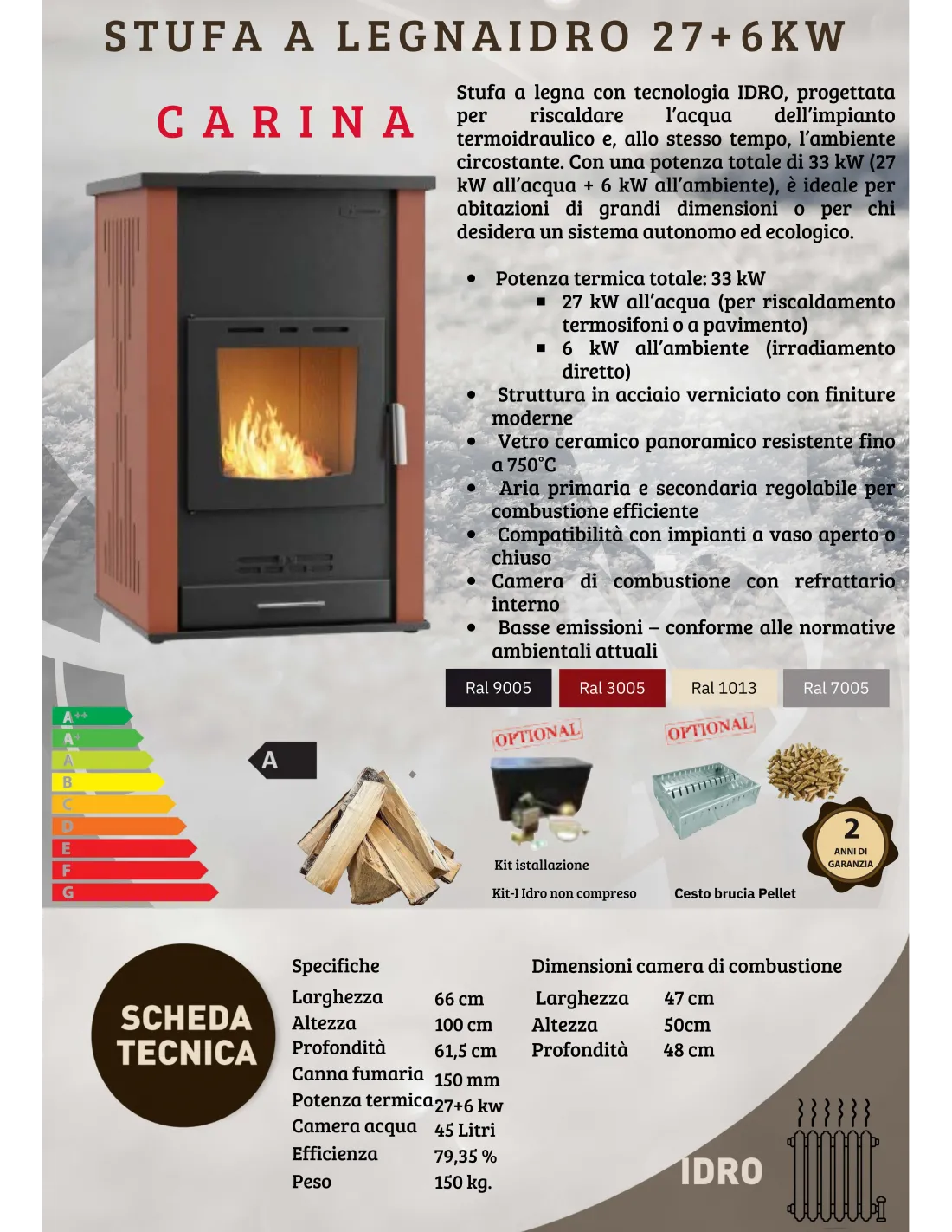 Stufa a Legna IDRO 27 + 6 kW modello Carina