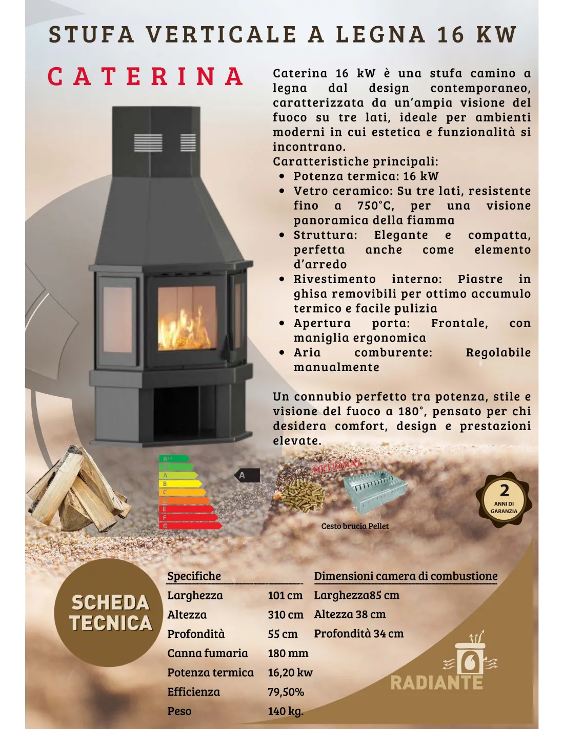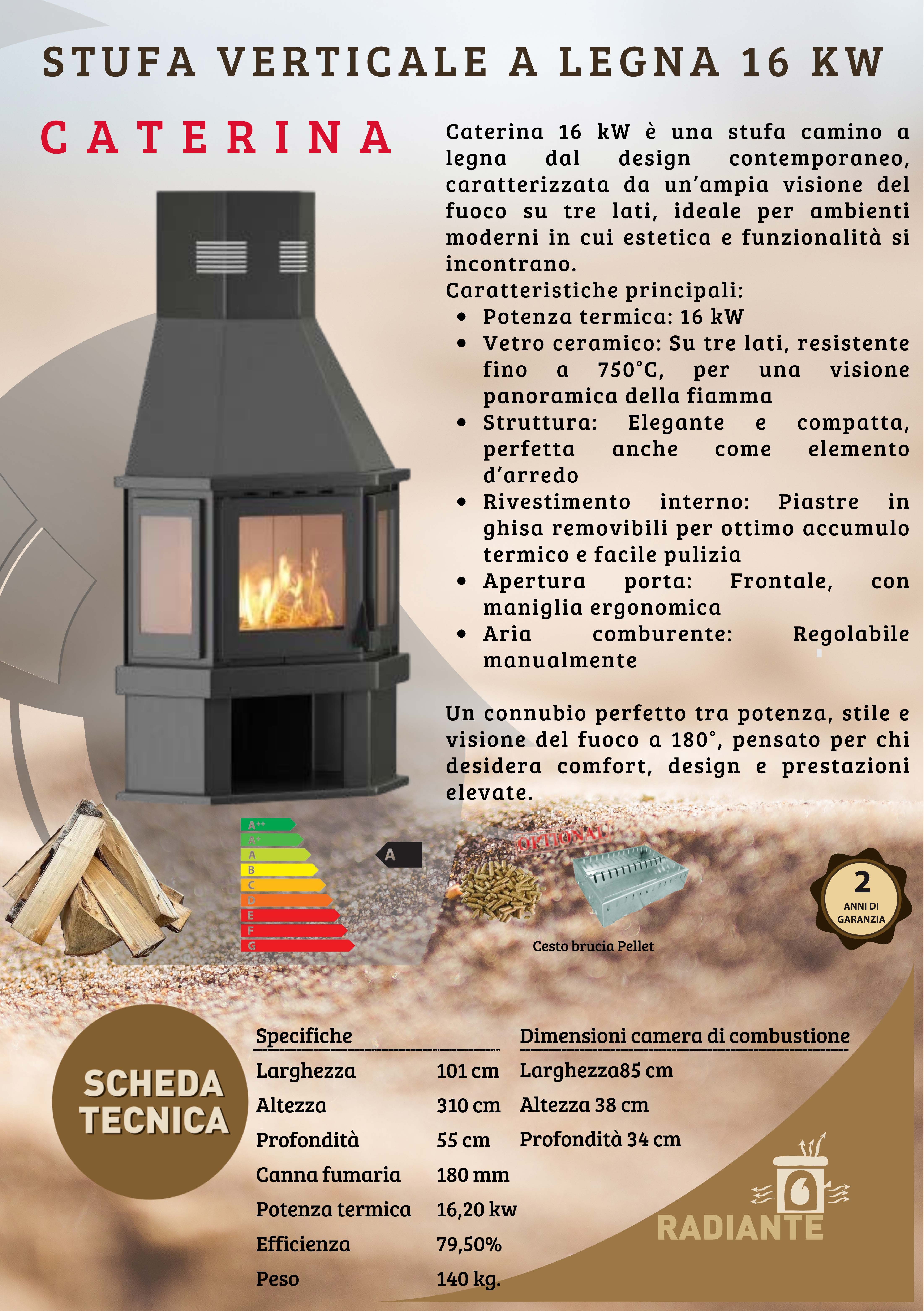 La Caterina 16 kW è una stufa camino a legna dal design contemporaneo, caratterizzata da un’ampia visione del fuoco su tre lati, ideale per ambienti moderni in cui estetica e funzionalità si incontrano.