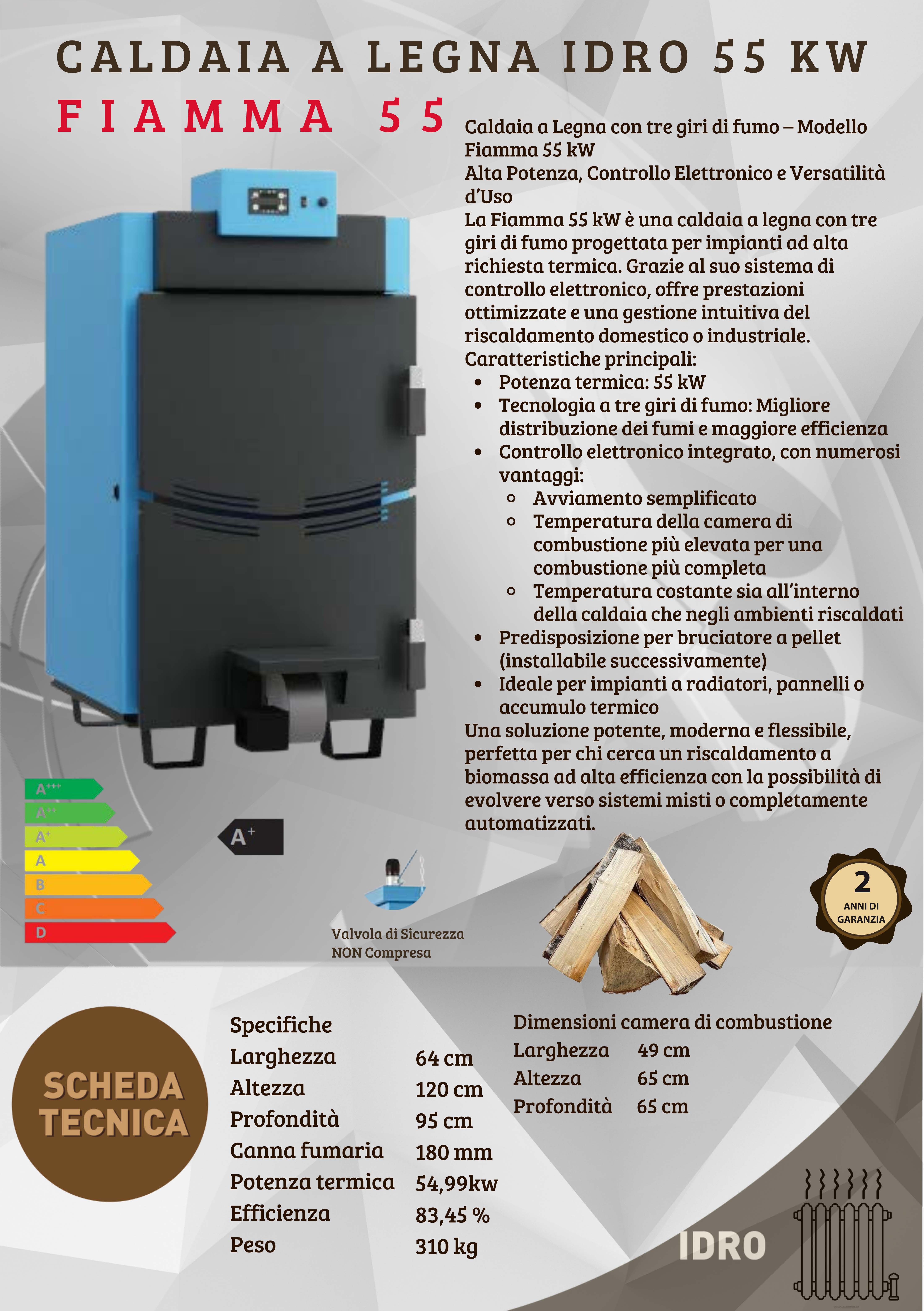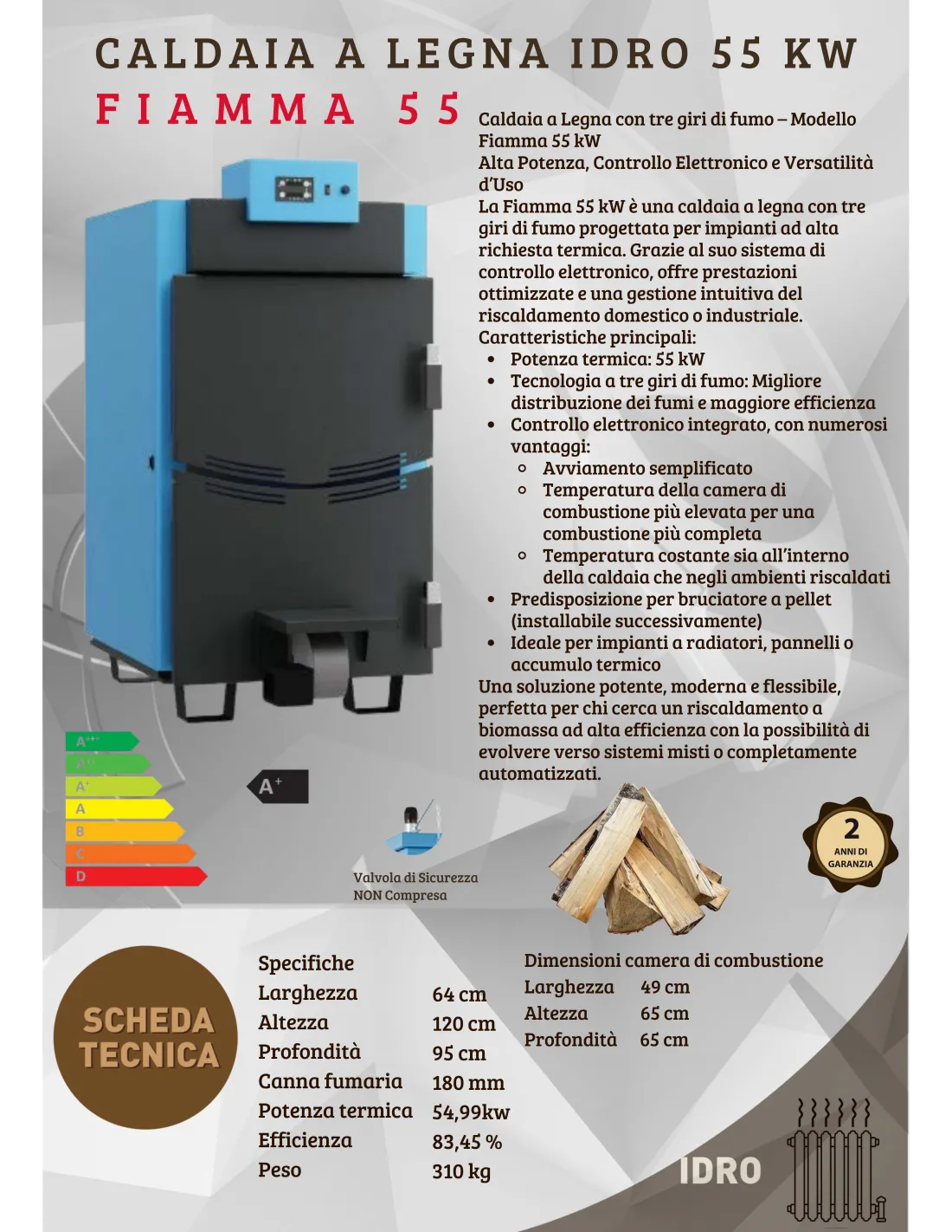 La Fiamma 55 kW è una caldaia a legna con tre giri di fumo progettata per impianti ad alta richiesta termica. Grazie al suo sistema di controllo elettronico, offre prestazioni ottimizzate e una gestione intuitiva del riscaldamento domestico o industriale.