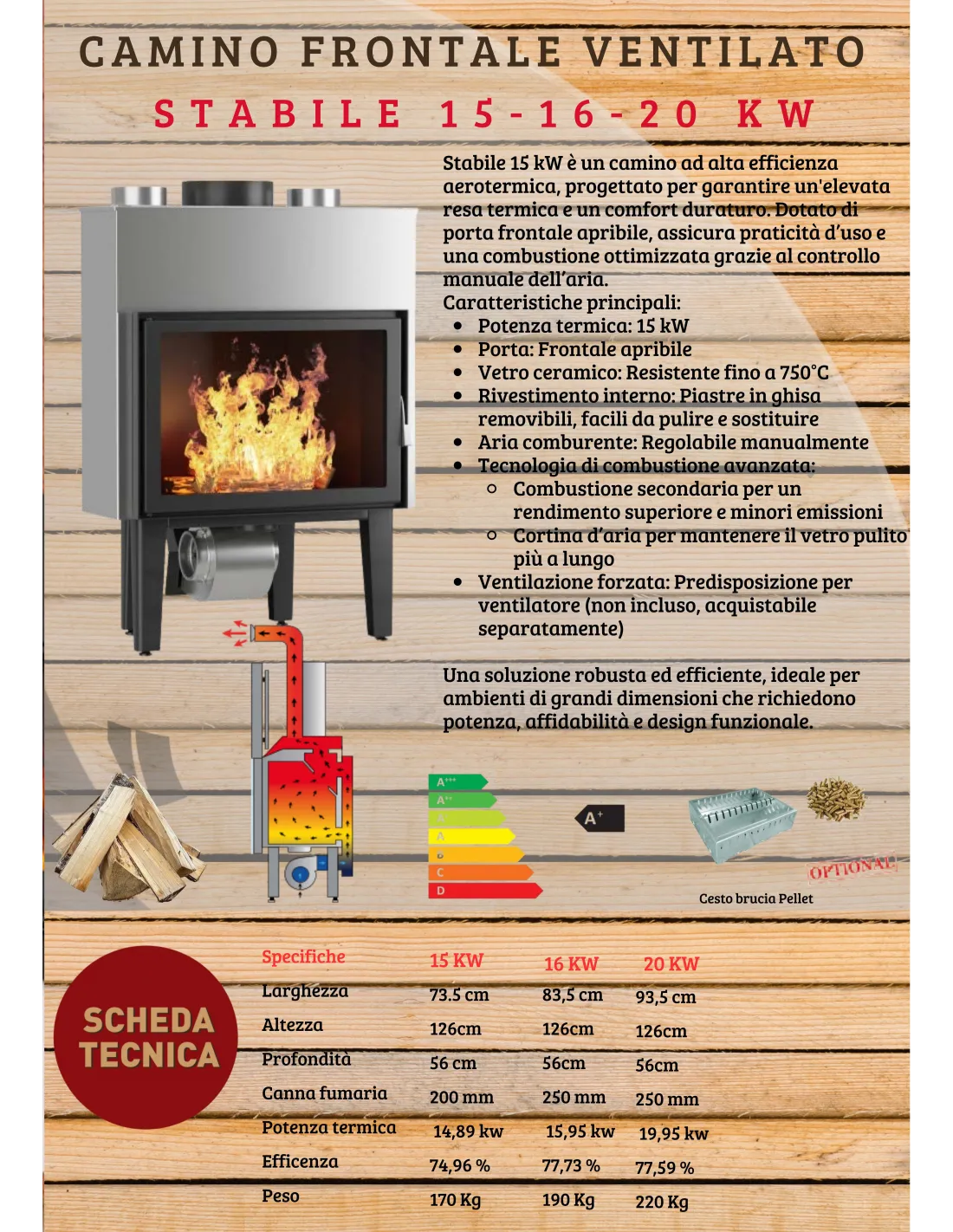 Stabile 20 kW è un camino ad alta efficienza aerotermica, progettato per garantire un'elevata resa termica e un comfort duraturo. Dotato di porta frontale apribile, assicura praticità d’uso e una combustione ottimizzata grazie al controllo manuale dell’aria.