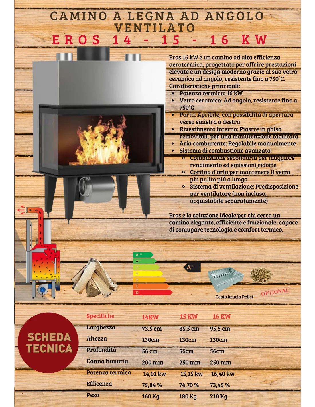 Eros 15 kW è un camino ad alta efficienza aerotermica, progettato per offrire prestazioni elevate e un design moderno grazie al suo vetro ceramico ad angolo, resistente fino a 750°C.